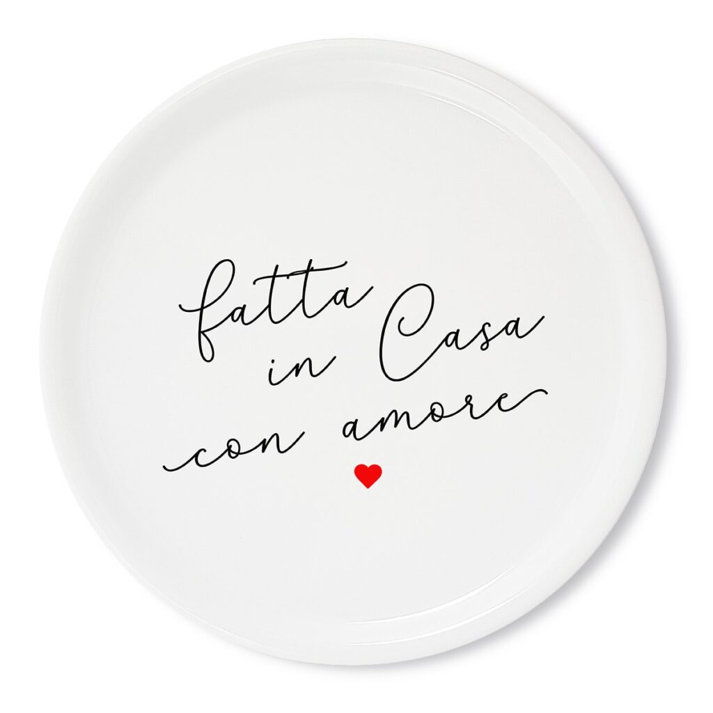 Piatto in ceramica Dudecor con scritta “L’ingrediente segreto è l’amore” ambientato su tavola con ingredienti per pizza
